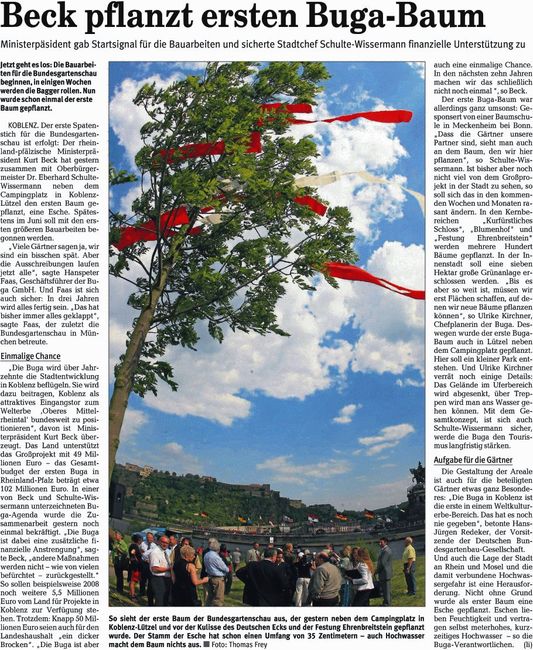 Die Esche steht am "Lützeler Eck" am schönsten Campingplatz der Welt. In seiner Rede hob der Landesvater die Bedeutung der BUGA2011 hervor und hob in Erinnerung, dass mehr als 400.000.000,- Euro an Landesförderung in die Stadt an Rhein und Mosel geflossen sind. Darin sind auch die 49 Millionen Landesförderung für die BUGA2011 enthalten. An der Zeremonie nahmen auch die SPD-Fraktionsvorsitzende Marion Lipinski-Naumann, der BUGA-Aufsichtsrat Gerhard Lehmkühler und die Landtagsabgeordneten David Langner und Heribert Heinrich teil. Beim "Familienfoto der SPD" zur BUGA 2011 gruppierten sich auch die Ratsmitglieder Ulla Hühnerfeld und Fritz Naumann und ihr Kollege und SPD-Vorsitzender Christian Altmaier dazu. Die BUGA2011 wird am 15. April 2011 ihre Pforten öffnen und erwartet mehr als 2.000.000 Besucher am Rhein-Mosel-Eck. Unsere Fotos zeigen BUGA-Geschäftsführer Hanspeter Faas bei der Eröffnung, die Macher der BUGA um Ministerpräsident Kurt Beck beim Baumpflanzen und die SPD Koblenz mit Kurt Beck und Roger Lewentz.